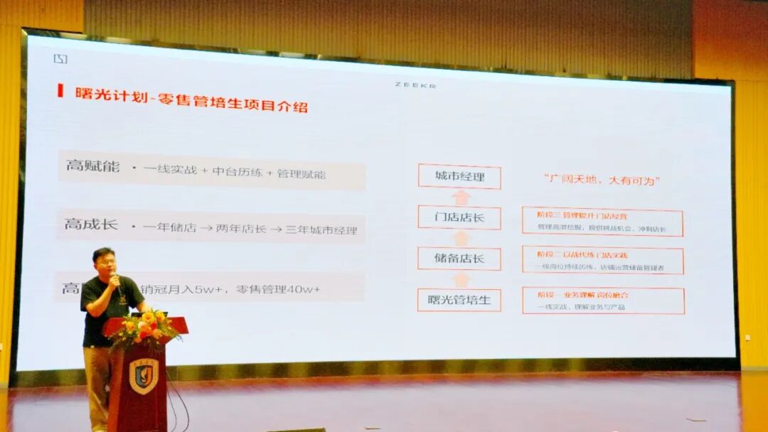 學(xué)習(xí)營銷專業(yè)的學(xué)生鄧瑩說,其實我來之前還挺迷茫,不知道大公司招什么,自己能做什么,直到吉利控股集團的校招宣講開始,這種“不確定”慢慢變成了“想試試”。極氪的管培生計劃更讓我動了心。陳老師提到學(xué)校2021屆的郝鳳英師姐,現(xiàn)在已經(jīng)是廣州門店店長,原來校友已經(jīng)在企業(yè)里面迅速成長,并且做出了成績,那我們也有機會!一年培養(yǎng)期就能沖儲備店長,還有帶薪實習(xí)機會,這種“看得見的晉升路徑”比模糊的“有發(fā)展空間”實在多了。