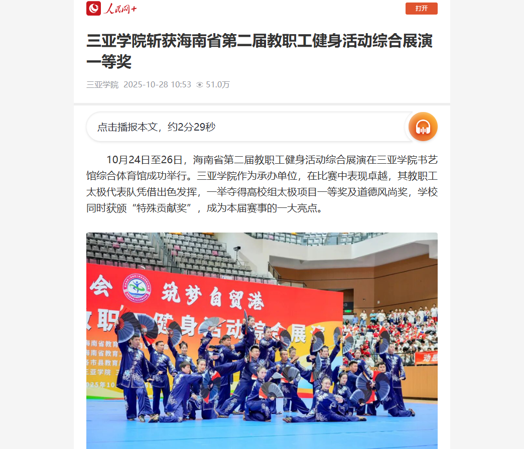 10月24日至26日,海南省第二屆教職工健身活動綜合展演在三亞學(xué)院書藝館綜合體育館成功舉行。三亞學(xué)院作為承辦單位,在比賽中表現(xiàn)卓越,其教職工太極代表隊?wèi){借出色發(fā)揮,一舉奪得高校組太極項目一等獎及道德風(fēng)尚獎,學(xué)校同時獲頒“特殊貢獻獎”,成為本屆賽事的一大亮點。